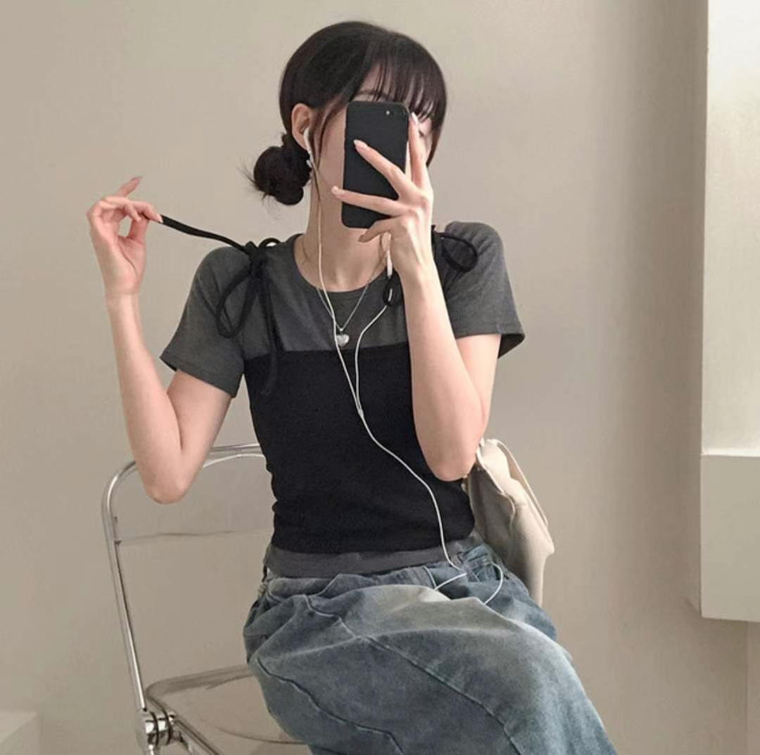 【 ⸝⸝⸝⸝❤︎早鳥~ 溫柔拼色𝗧𝗲𝗲】綁帶兩件裝𝗧𝗼𝗽